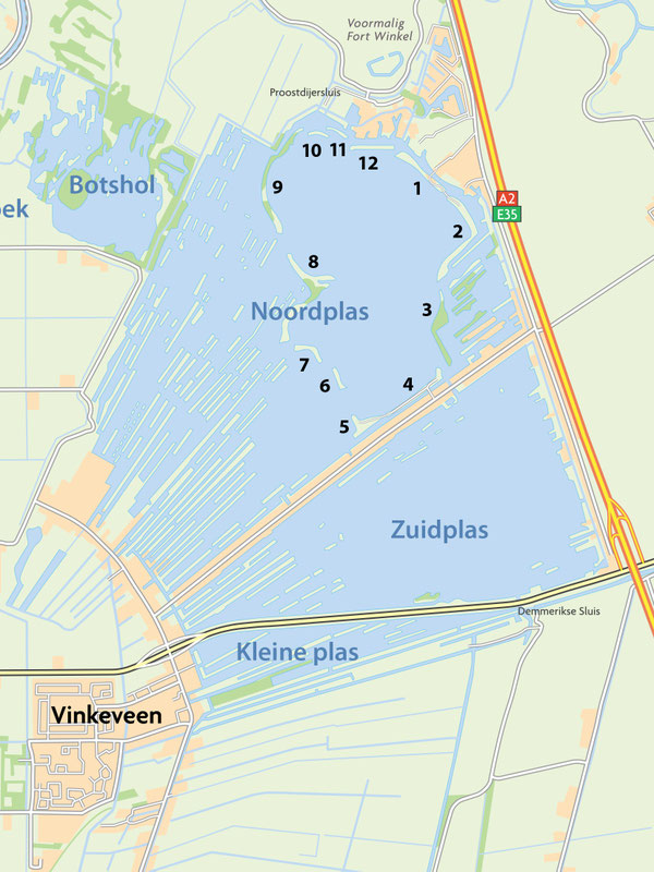 De grote waterdiepte op de Noordplas geeft een hoge golfslag. Om de nog overgebleven legakkers tegen deze golfslag te beschermen zijn twaalf zandeilanden opgespoten. Deze eilanden met beschoeiing dienen niet alleen als dijken om de golven te breken, maar vormen ook een unieke locatie voor recreatie. De zandeilanden 1, 2, 4 en 5 zijn bereikbaar vanaf de weg. De overige eilanden zijn uitsluitend bereikbaar vanaf het water.